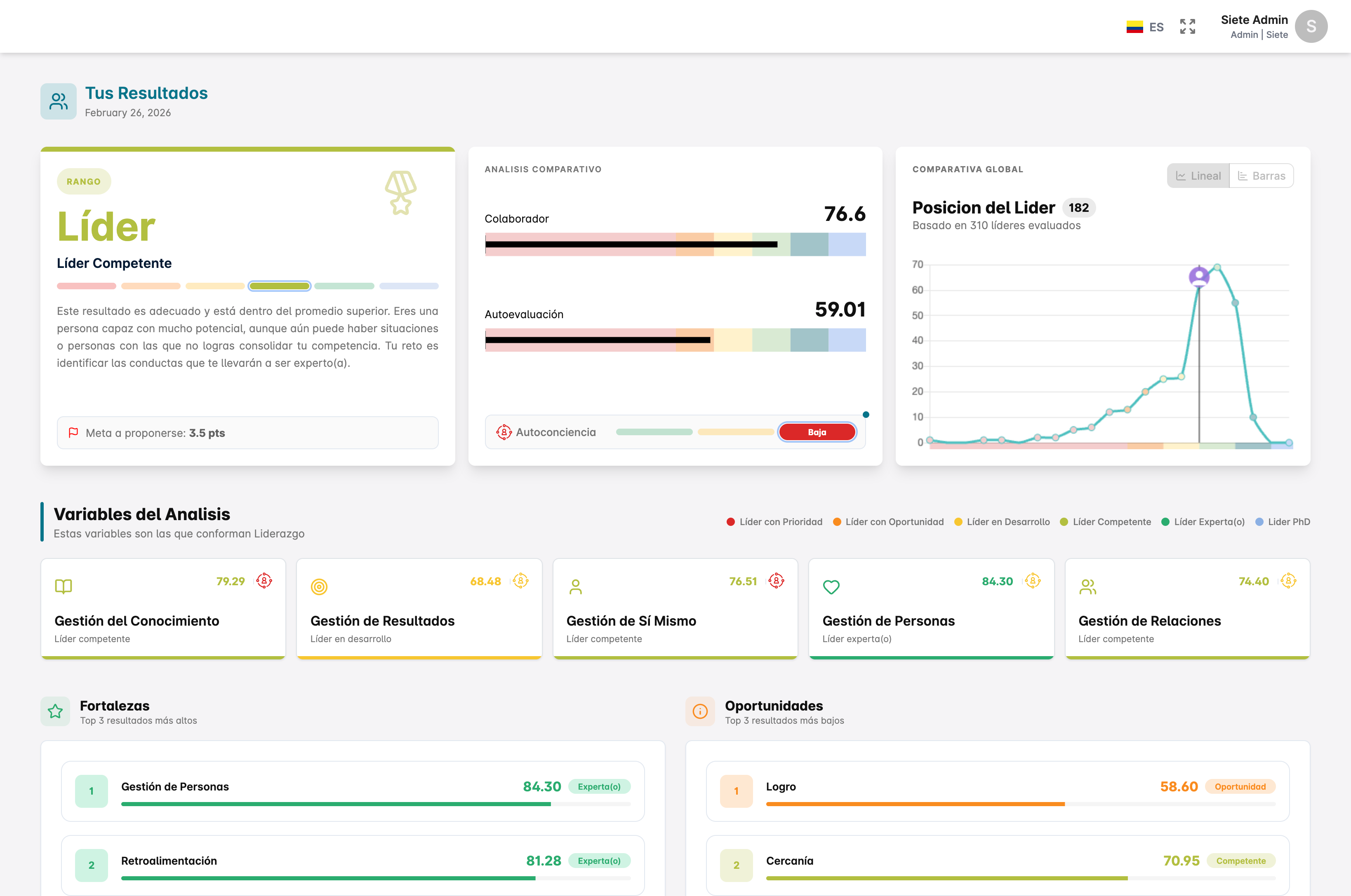 Compara tu desempeño con otros líderes evaluados y encuentra tu posición en el ranking.